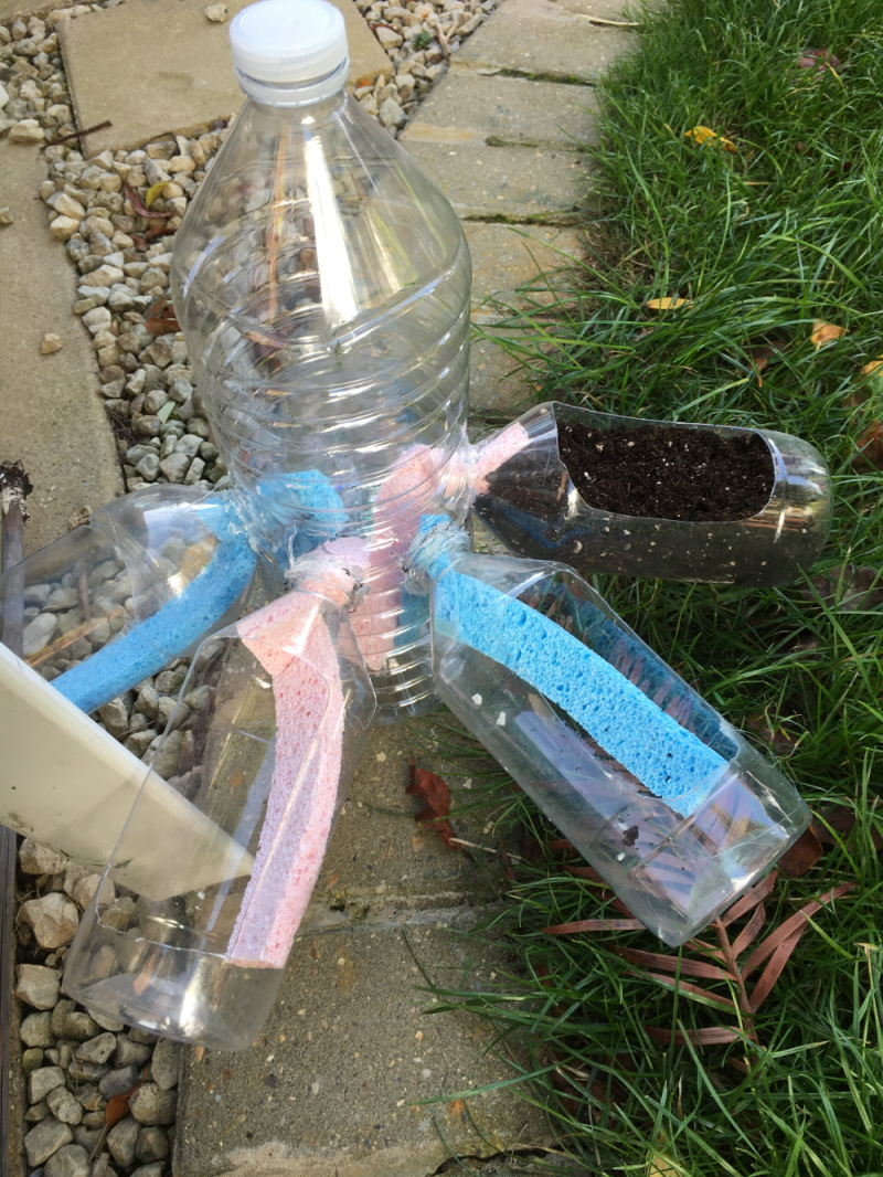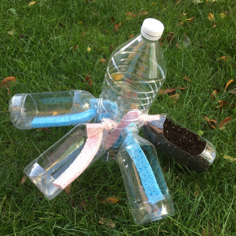 For each bottle, cut a segment out which will be where the earth will go for planting. Hot glue gun the four bottles (without the lids) into position. Again look at my photos.