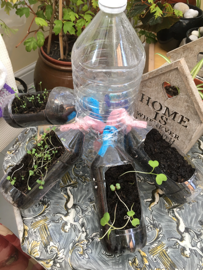 Fill each small bottle with soil and plant your seeds. You are aiming to produce micro-veg where you cut off the tops of the leaves and use in salads, so plant as many or as few seeds as you like. I usually plant 10-15 seeds per bottle.