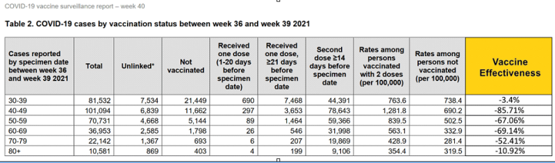 Now, here’s a snapshot of the data for week 42 (18th October 2021) from the UK HAS in those age-groups which likewise shows the rates of Covid infections among the various age groups for vaccinated and unvaccinated persons. For all age groups over 30 the cases are much higher in those that are vaccinated: