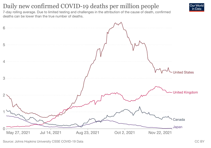 The same is found when we compare Covid deaths in UK, USA and Canada with those in Japan, where millions of lives seem to have been saved: